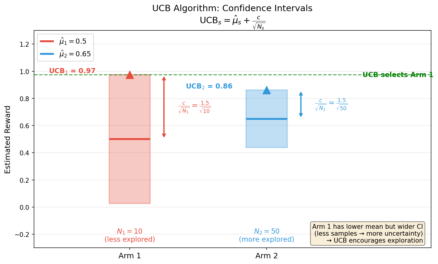 \(UCB_{a,t} \asymp \hat \mu_a + \frac{c}{\sqrt{N_{a,t}}}\)