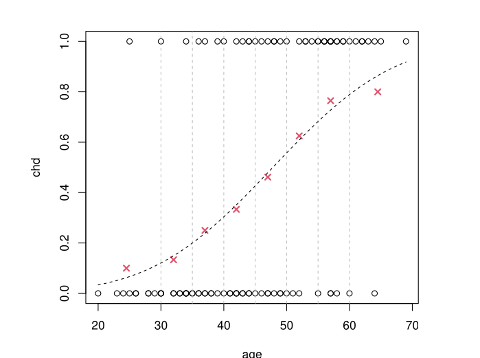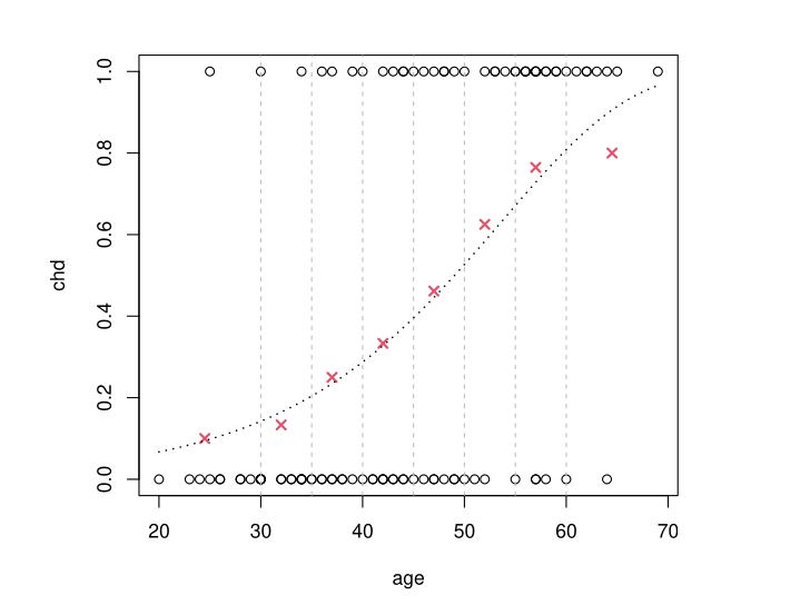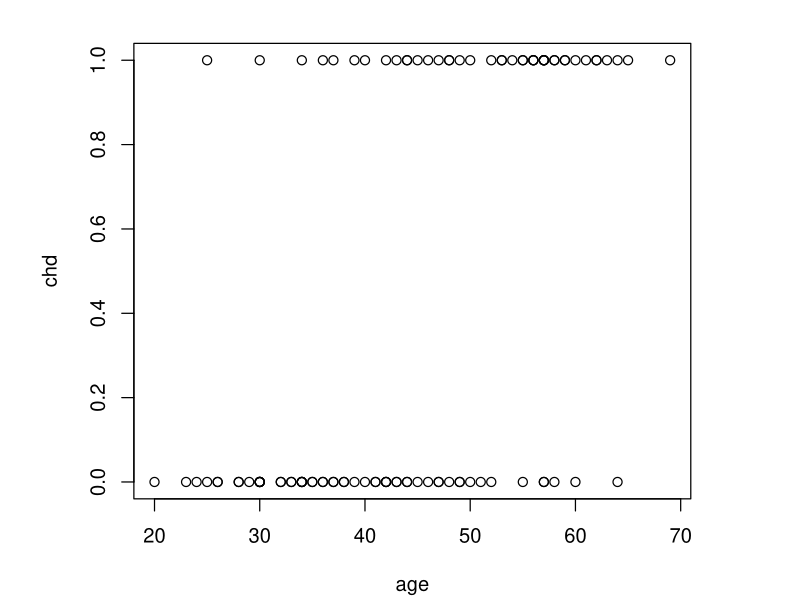 Data Description: Presence of chd as a function of age \(Y = \text{chd} \in \{0,1\}\), \(X = \text{age}\)