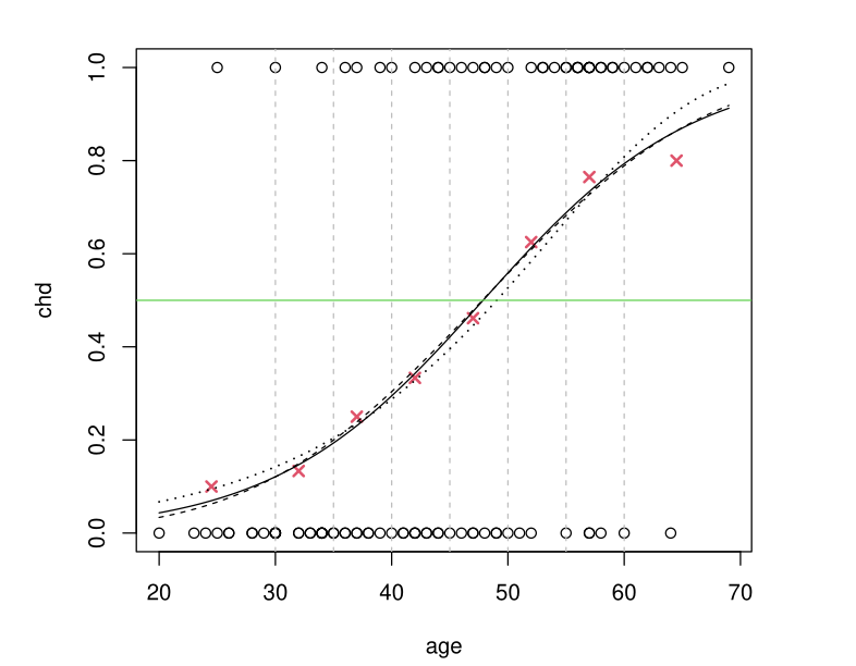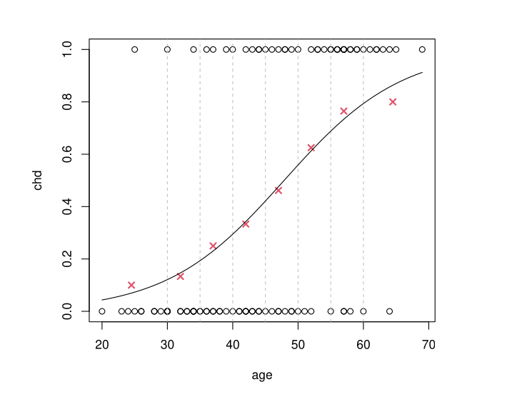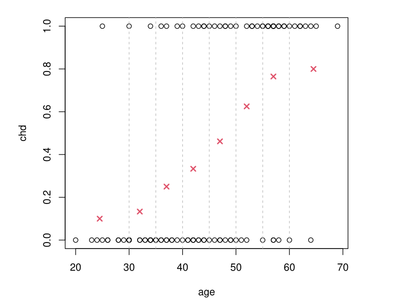 We want to estimate \(p(x) = \E(Y|X = x) = \P(\text{chd} = 1|X = x)\) for all \(x\)