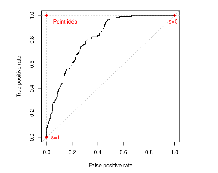 The AUC (area under the curve) is a quality indicator of the model (\(0 \leq \text{AUC} \leq 1\)).