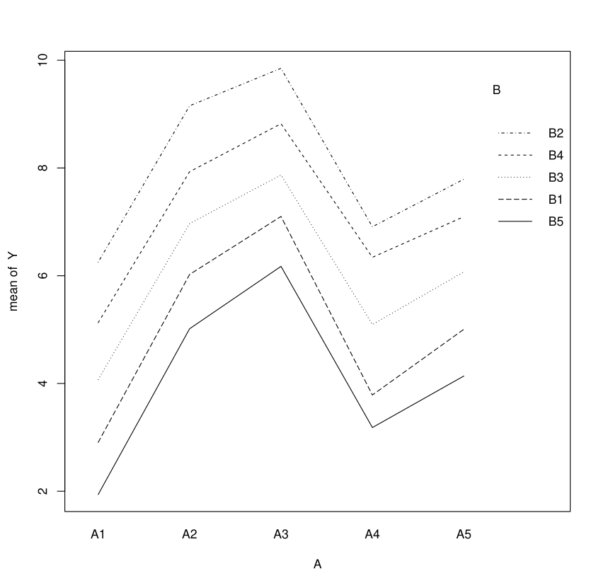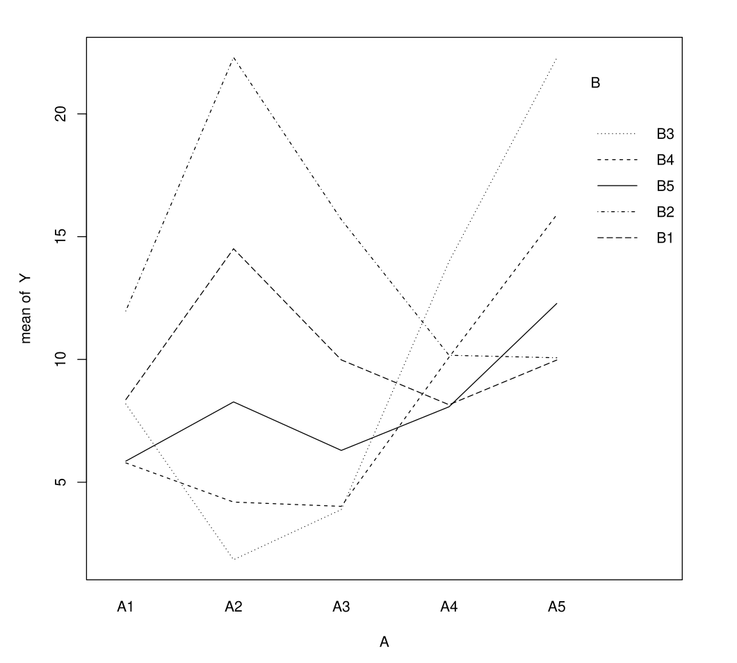 First, in the additive model with interaction, \(Y_{ijk} = m + \alpha_i + \beta_j + \varepsilon_{ijk}\)
